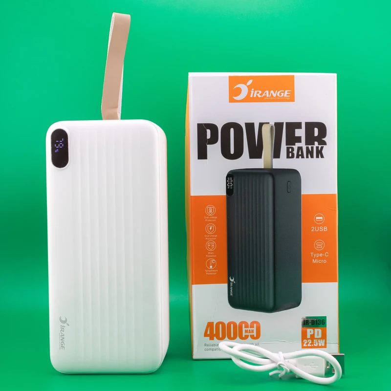 پاوربانک آیرنج مدل(D – 136) ظرفیت 40000 میلی‌آمپرساعت یکی از محصولات جذاب و کارآمد شرکت آیرنج است که با مشخصات فنی قابل توجه خود، امکان شارژ سریع و طولانی مدت انواع دستگاه‌های همراه را فراهم می‌کند. این پاوربانک مجهز به توان خروجی 22.5 وات بوده و از فناوری‌های پیشرفته‌ای چون محافظت در برابر آسیب‌های افت ولتاژ و جریان بهره می‌برد. یکی از ویژگی‌های این محصول، امکان نمایش میزان شارژ باتری به صورت درصدی است که به کاربران کمک می‌کند تا در هر زمان از وضعیت شارژ باتری آگاه باشند. همچنین آیرنج D-136 دارای 4 درگاه خروجی است که به افراد این امکان را می‌دهد تا به طور همزمان چندین دستگاه را شارژ کنند. این مدل 3 ورودی برای شارژ پاوربانک در اختیارتان قرار می‌دهد. که شامل ( microUSB ) و ( USB-C ) و Type-A برای شارژ شدن و دو کانکتور Type-A و USB-C و microUSB که می‌تواند چندین دستگاه را به طور همزمان شارژ کنند . از این پاوربانک می‌توانید برای شارژ کردن تبلت خود هم استفاده کنید. ولتاژ ورودی برای این مدل 5.0 و 9.0 و 12 ولت و دارای ولتاژ خروجی‌های مختلفی است که از جمله آن‌ها می‌توان به 5V/3A،9V/2.22A،12V/1.6A اشاره کرد. این ویژگی باعث می‌شود که شارژ دهی به دستگاه‌های مختلف با سرعت و کیفیت بالا انجام شود. پاوربانک آیرنج D-136 دارای پورت تایپ A با ولتاژ خروجی‌های متنوع است : شامل 5V/3A ، 9V/2A ، 10V/2.25A ، 12V/1.5A .همچنین پشتیبانی از تکنولوژی USB Power Delivery ،است که سرعت شارژ دستگاه‌های متصل را به طور چشم‌گیری افزایش می‌دهد. همچنین ولتاژ خروجی ثابت 5 ولت پاور بانک آیرنج D – 136است، سازگاری گسترده‌ای با انواع دستگاه‌های قابل حمل ایجاد می‌کند. همچنین، ساخت بدنه پاوربانک از پلاستیک باعث شده است در عین حال مقاوم در برابر ضربه و خط و خش بوده و برای استفاده در سفرها و فعالیت‌های روزمره گزینه ایده‌آلی به شمار آید.